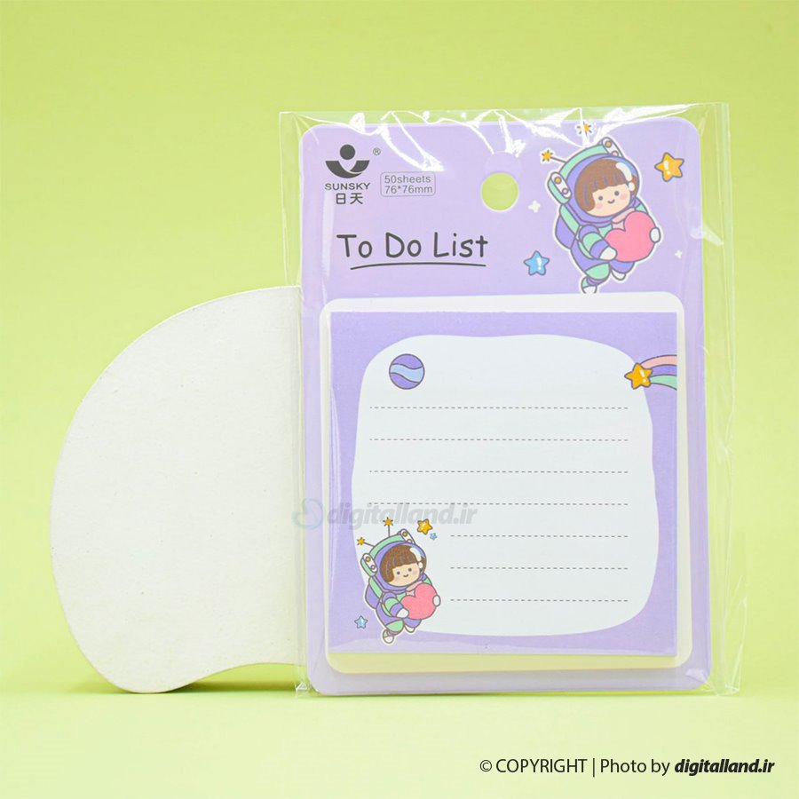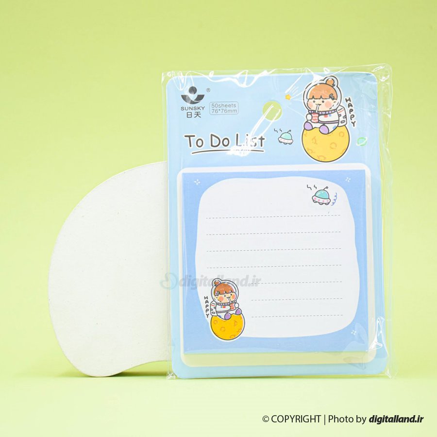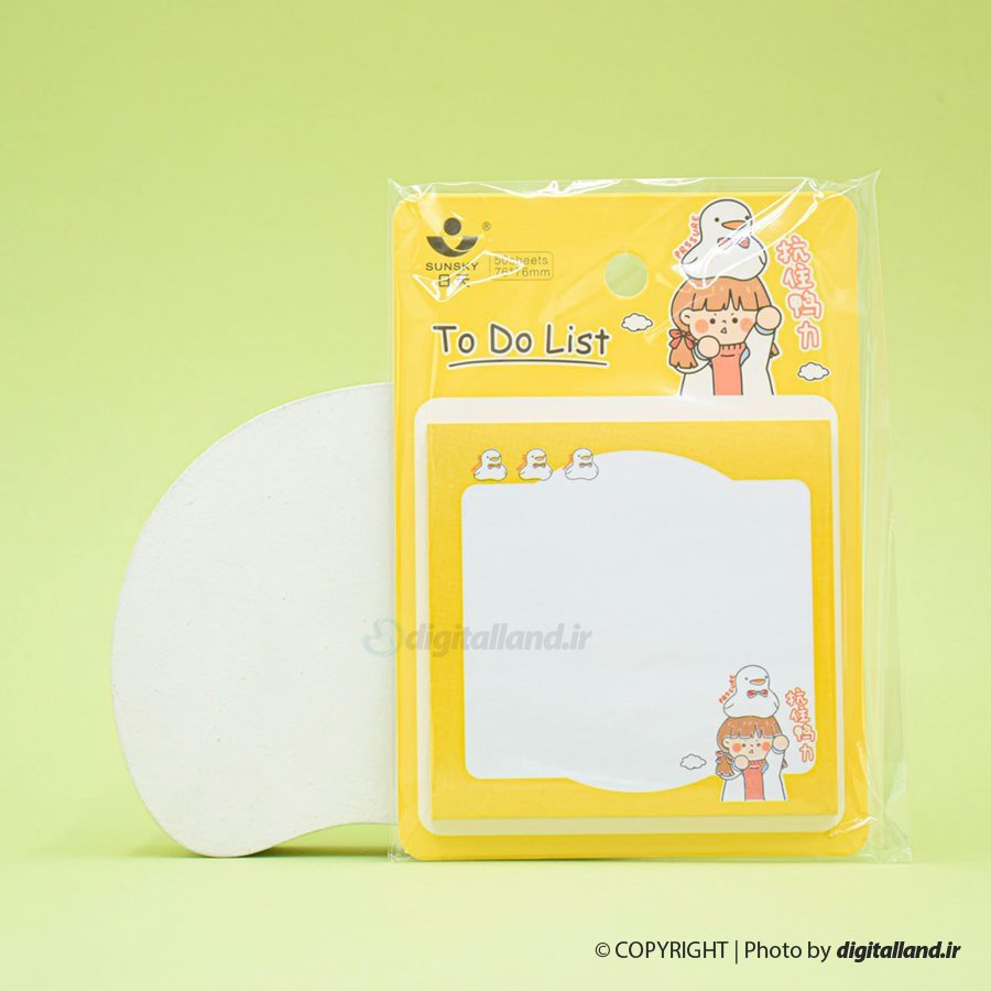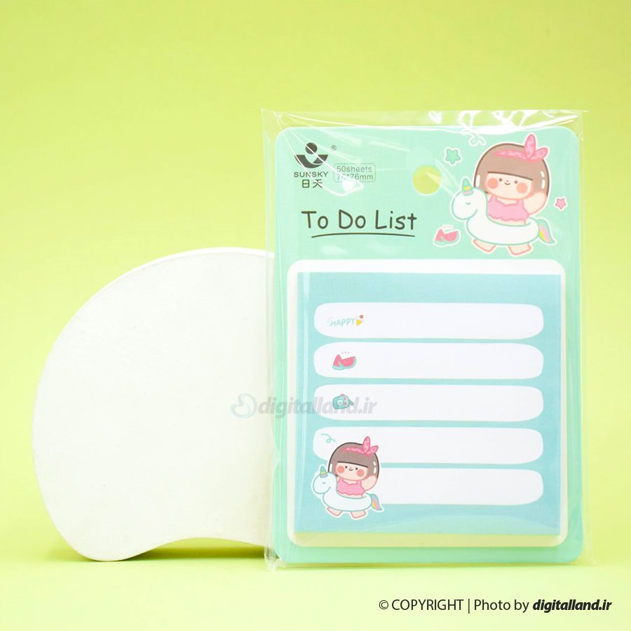 این محصول یک یادداشت پشت چسب دار است. که به راحتی می توان نکته برداری کرد و به کتاب، جزوه و حتی وسایل مختلف مثل یخچال چسباند.
