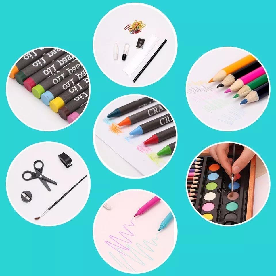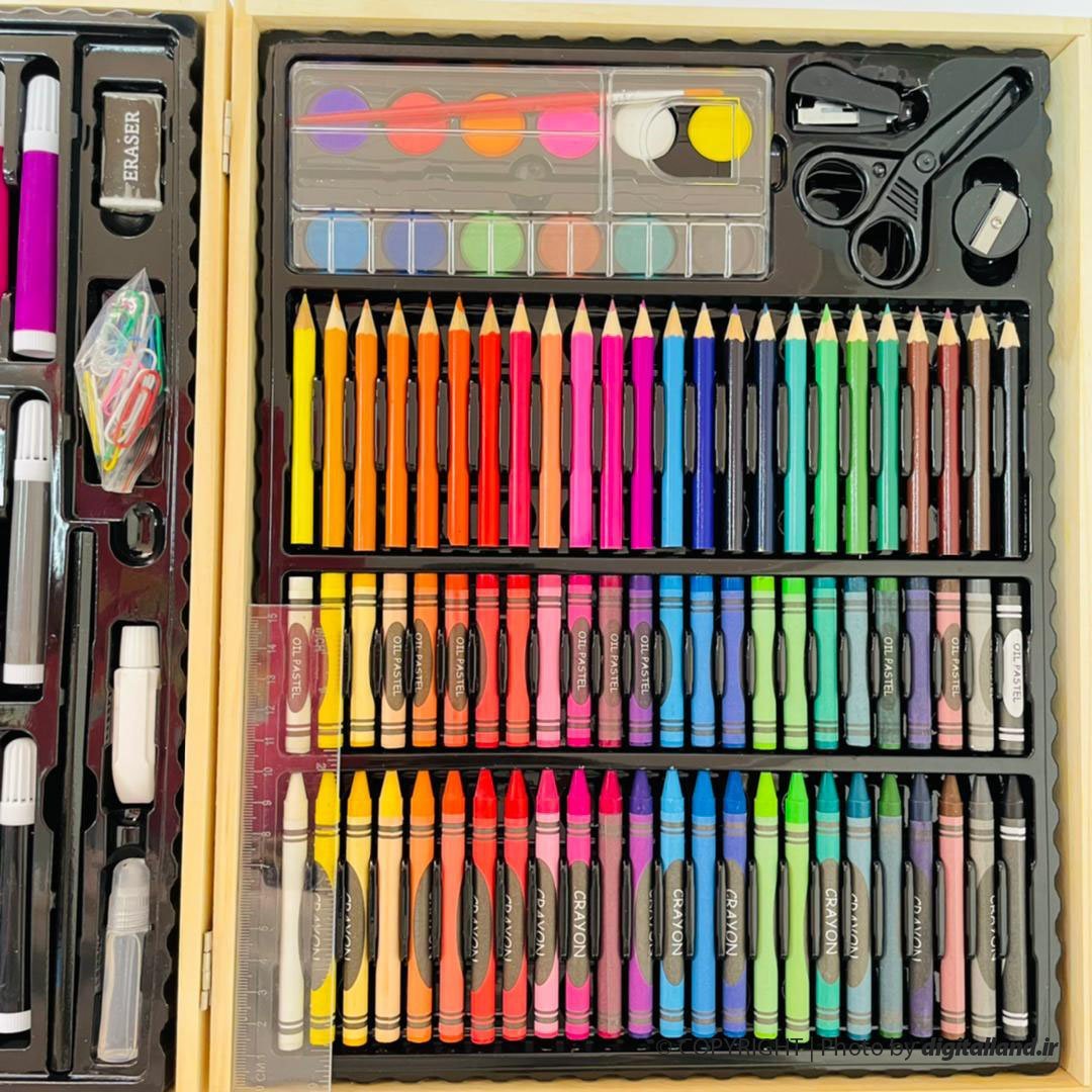 - 24 عدد مداد رنگی- 24 عدد پاستل روغنی- 24 عدد پاستل گچی- 36 عدد ماژیک- آبرنگ 12 رنگ- یک عدد پاک کن- یک عدد خط کش 15 سانتی متری- یک عدد قیچی- یک عدد منگنه- یک عدد تراش- یک عدد مداد سیاه