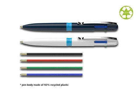 خودکار چهار رنگ با رنگ های نوشتاری مشکی، قرمز، آبی و سبز، رنگ بدنه سفید. Take 4 راه حل عالی 4 در 1 را برای برنامه ریزی، سازماندهی و ساختار ارائه می دهد. فناوری Viscoglide® یک نوشتار فوقالعاده صاف و لغزنده با عرض خط M ایجاد میکند. این باعث صرفه جویی در انتشار بیش از 84٪ CO2 (در مقایسه با پلاستیک معمولی) می شود. خودکار چهار رنگ را می توان با شارژ مجدد «Take 4» پر کرد. این امر ضایعات را کاهش می دهد و مکرراً لذت نوشتن جدید را تضمین می کند. چهار رنگ نوشته بر اساس ISO 12757-2 ضد آب هستند. Take 4 با گیره فلزی محکم خود را می توان به هر جیب یا دفترچه یادداشت متصل کرد.