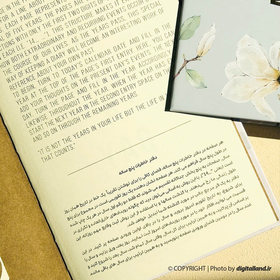 هرصفحه در دفتر خاطرات پنج ساله، در پنج بخش فضای مناسبی را در اختیار شما قرار می دهد تا وقایع مهم روز را در تاریخ مشخص در طول پنج سال ثبت نمایید. با این روش به آسانی می توان دید که چگونه رویدادهای خارق العاده و گاهی تکراری در طول زندگی ما رخ می دهند. با گذشت سالها و با استفاده از این روش ثبت وقایع مهم روزانه، این دفتر به یک اثر مرجع جالب در مورد گذشته شما تبدیل خواهد شد.
