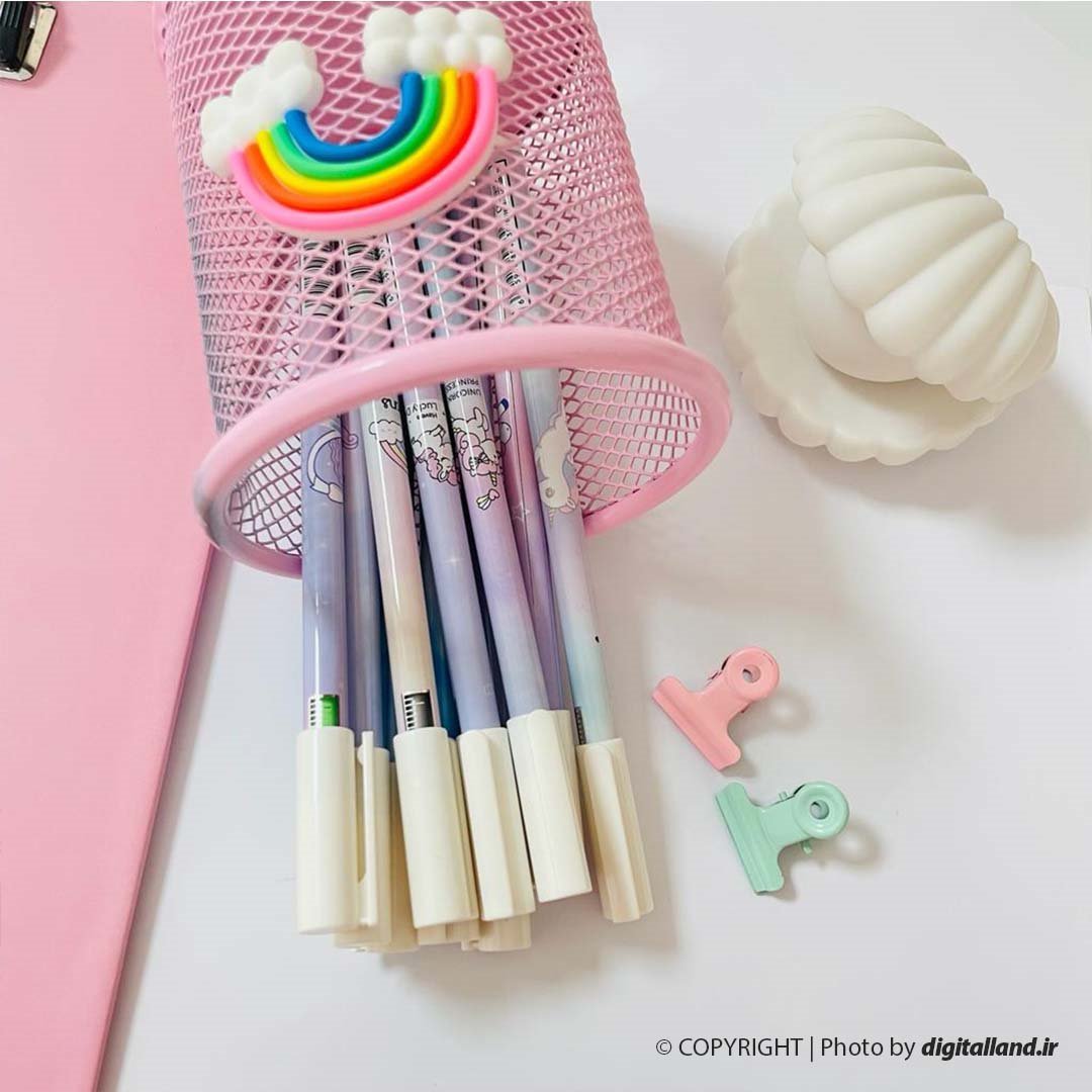 9 رنگ دارد و از رنگ طلایی دو عدد روان نویس دارد (رنگ بندی در عکس مشخص است)