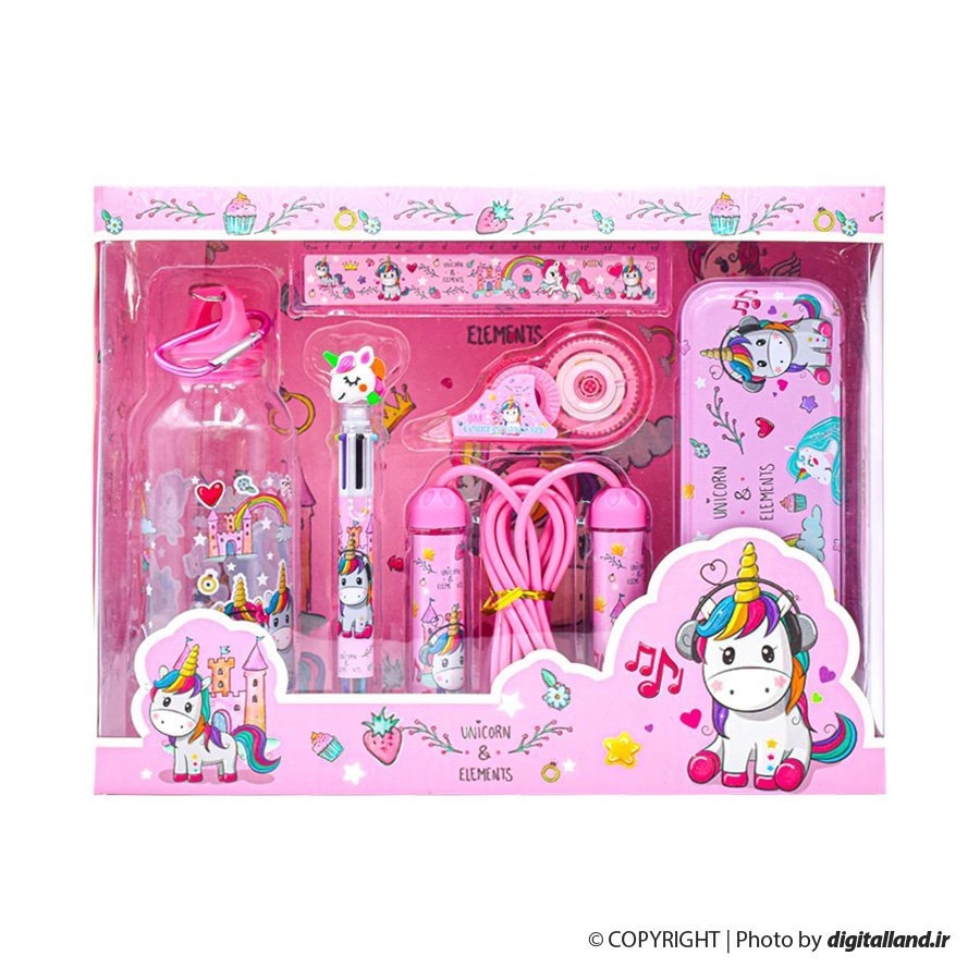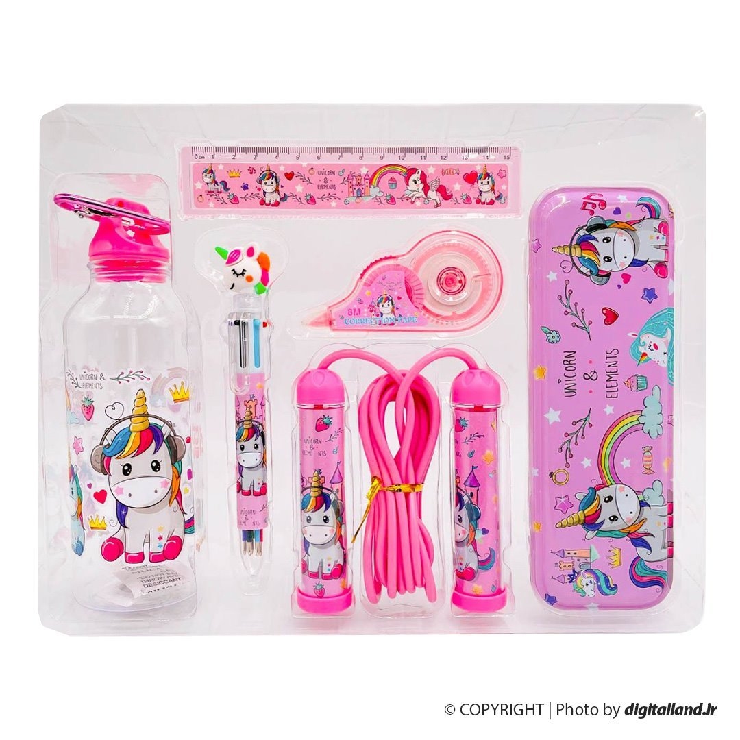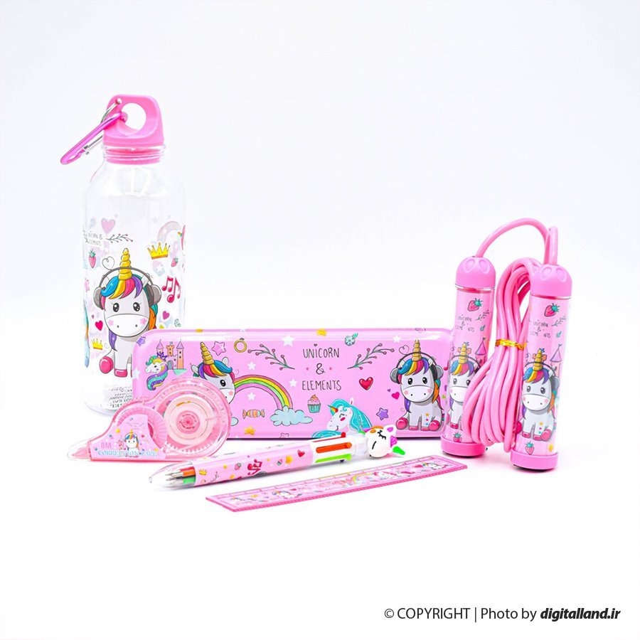 - 1x قمقمه- 1x خودکار چند رنگ- 1x غلط گیر نواری- 1x جامدادی- 1x خط کش- 1x طناب ورزشی