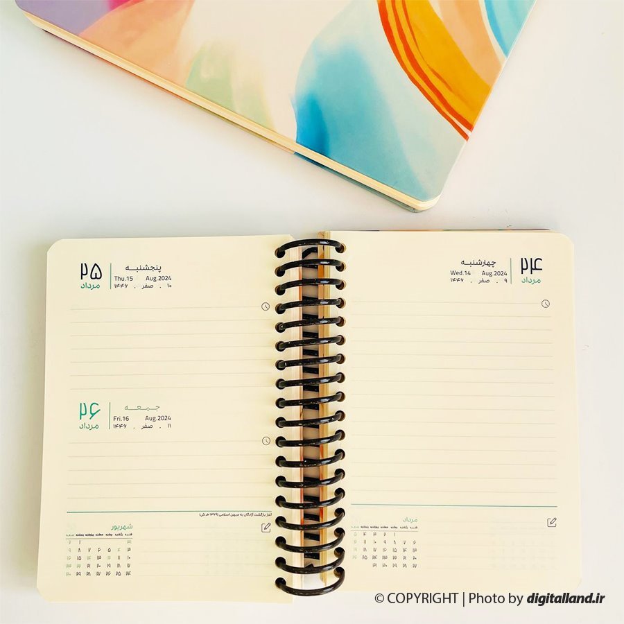 - صحافی سیمی بسیار نرم- دارای کش برای بسته شدن کامل سررسید- دارای صفحه ی 1403 در یک نگاه- دارای صفحه یادداشت تاریخ تولد و روزهای مهم سال- هر ماه دارای صفحه ی تمام ماه در یک نگاه می باشد- روزهای پنجشنبه و جمعه در یک برگه هستند